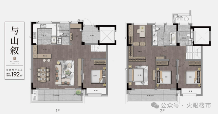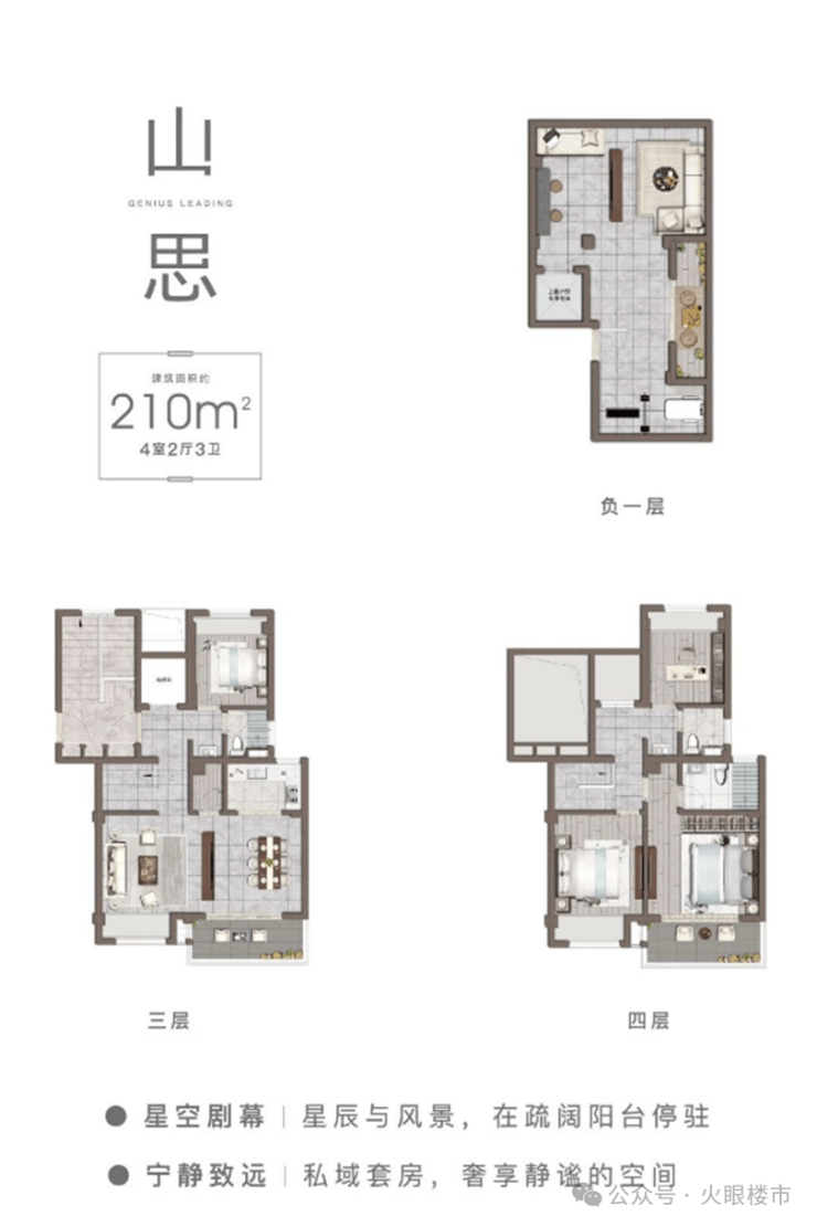 山水叠墅:建面约190-210㎡,4层立体空间,上层览景,下层拥院。