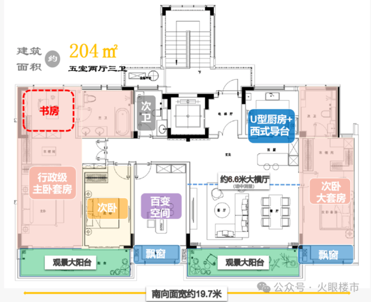 204㎡大平层,以五室两厅三卫布局,成就南向约19.7米、六开间朝南的奢阔尺度。客餐厅、主卧及三次卧全景一字排开,搭配2个约6.6米、270°环幕景观阳台,形成超广角视野。