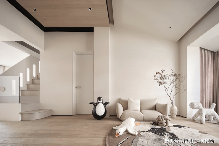下方设计师特意开出一个低窗,与露台取得了巧妙的联动,呼吸感十足,让人在客厅之中,可以抬眼望向窗外景观,将生活的张与驰拿捏得恰到好处。