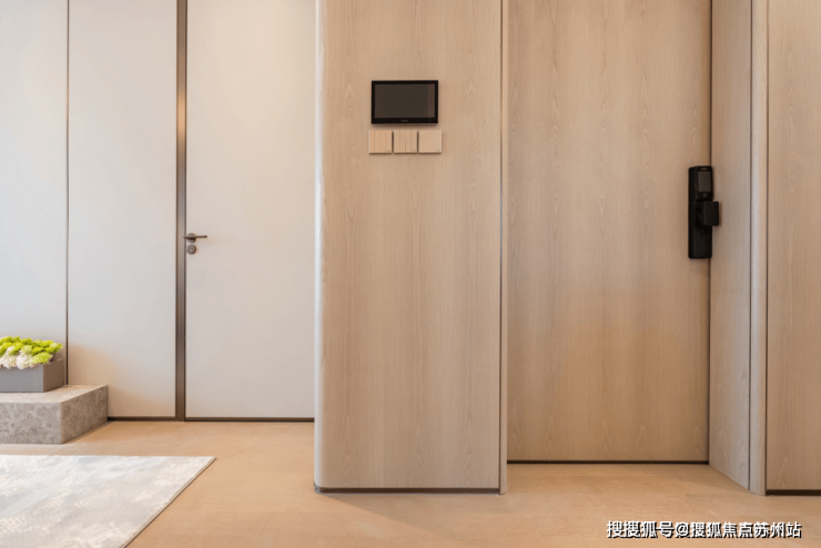 2、国际化审美,色系高度统一,营造连贯和谐的视觉观感实现单一空间的美感并非难事,然而要达成空间之间的连贯统一,则需要极致的巧思与细节把控。印象最深的是,站在电梯厅,四周墙面、地面、天花板,包括电梯几乎都被同一种色系温暖包裹,为了更好与环境相融,电梯轿厢地面、呼叫面板采用意大利GUCCI红。开启入户门,室内空间色调又与电梯厅高度统一,观感一气呵成。