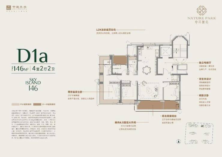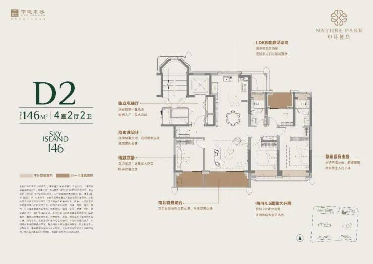 146㎡户型:两梯两户设计,独立电梯厅,南向面宽约 15 米 。