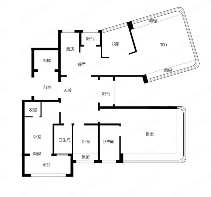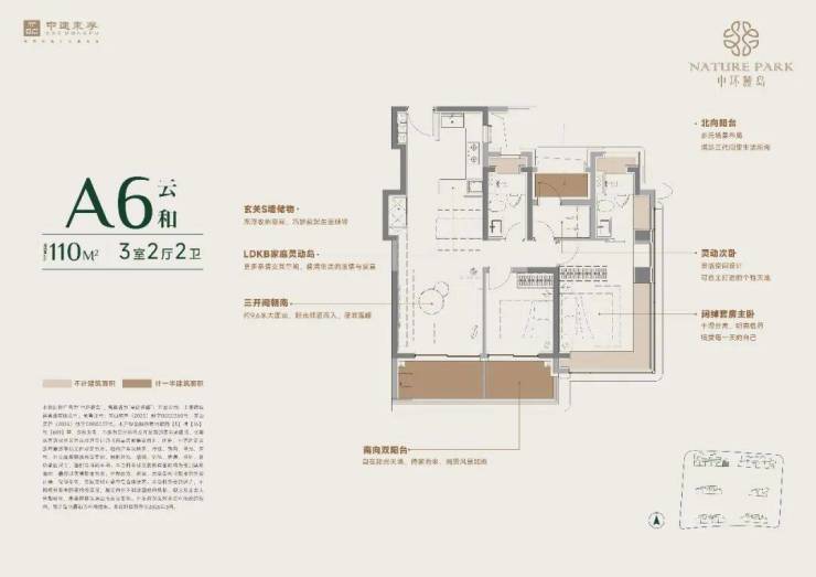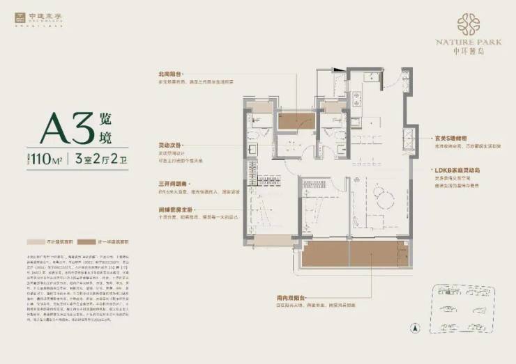 110㎡户型:设有约 270 度转角飘窗,LDKB 一体化布局。
