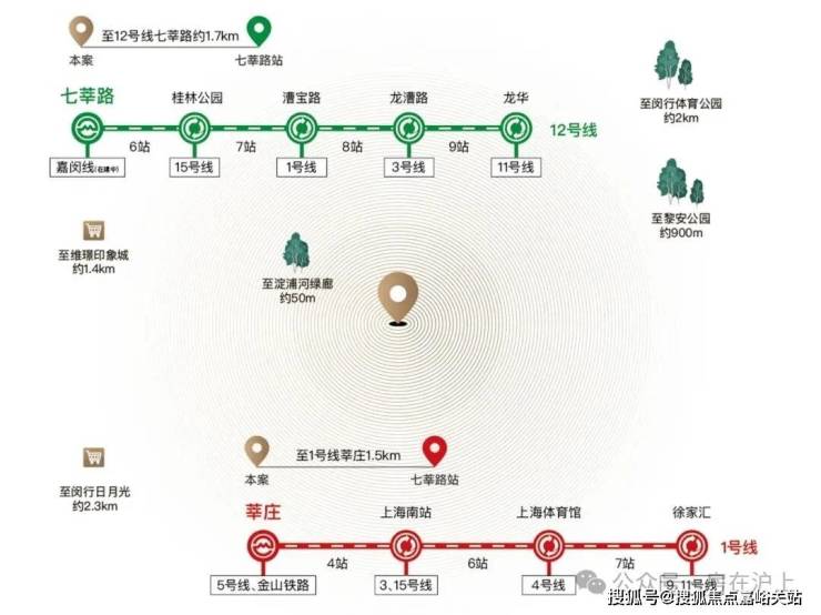 商业方面,离项目最近的商业是12号线七莘路站地铁上盖综合体维璟印象城,直线距离仅相距约1.4公里