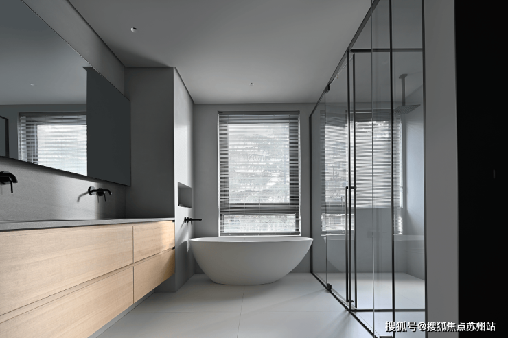 浴室贴心地做了三分离设计,完美践行了极简设计背后暗藏的功能主义.灰色与木色交融,创造出平和舒适的视觉体验.