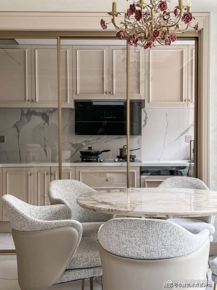 米白色+浅咖色的主色调,奠定了餐厅优雅的基调。质感十足的大理石圆桌,搭配线条圆润的浅色系织物软包座椅,舒适精致。金色边框玻璃移门让空间通透且具奢华感,与厨房风格相融。
