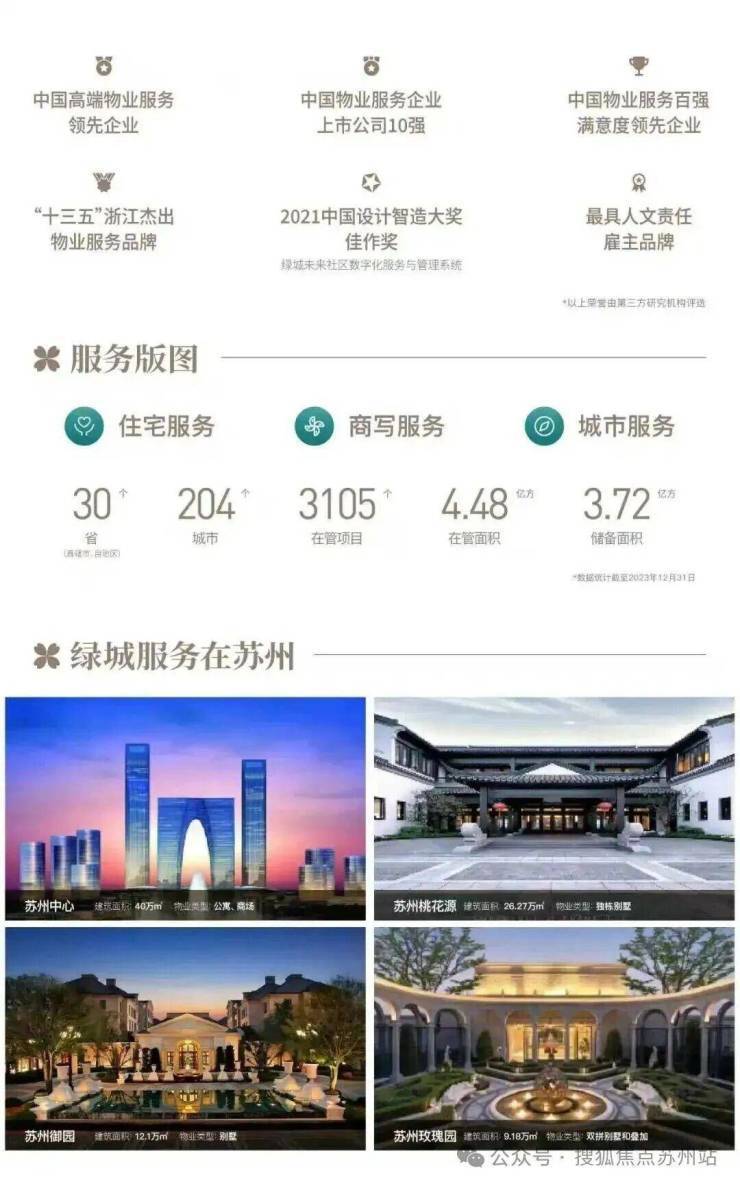 绿城服务集团成立于1998年,总部位于杭州市西湖区,是一家以物业服务为根基、以生活服务与城市服务为两翼,以智慧科技为引擎的数字化、平台化、生态型的现代服务企业。自2012年进入苏州市场,绿城服务经过多年精耕细作,目前服务面积近1328万㎡,服务业主超50000户。