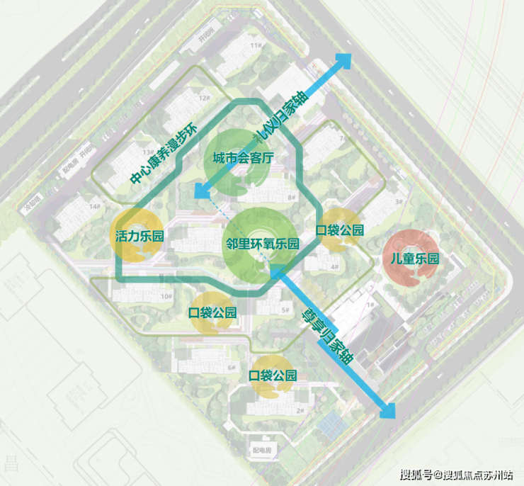 乐云庭融合自然之意,以多重绿植组团效果,构建"一环二轴多亮点"的景观空间结构,中心康养漫步环,让健康生活在自然里发生;礼仪归家轴,铺排业主归家的仪式感;邻里环氧乐园、城市会客厅、儿童乐园、活力乐园、口袋公园,功能迥异却紧密相连,自然绿意,围合生活之美。
