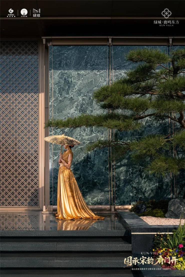 将视线延展,整体构成一幅融贯宋式美学的立体画卷:门庭两侧,两株特选古松苍劲挺拔,以傲然之姿守卫着这处昆山地标门户的庄严气度。