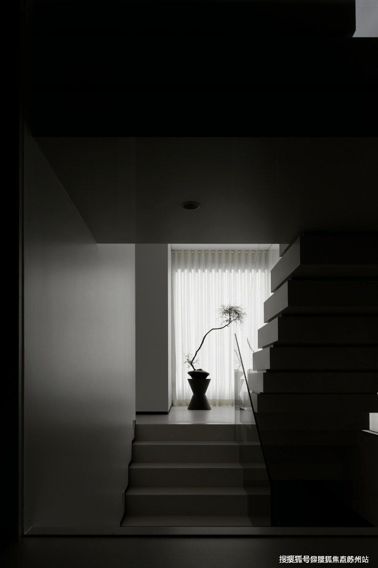 楼梯区完全被几何占据,自然光恰到好处的平衡,进一步呼应着空间的心境,衔接了生活和居所。