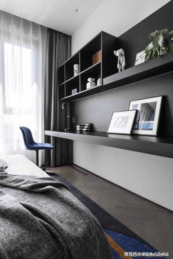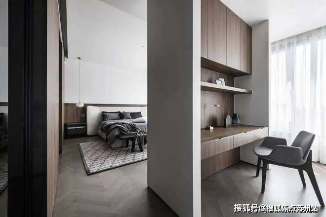 除此之外,还专门用装配式墙板隔出了一个小小的工作区/化妆区,与开放式的衣帽间在一起,背面也不会被浪费,可以当成电视背景墙使用,如果不看电视,安装上电影幕布就是妥妥的家庭影院。