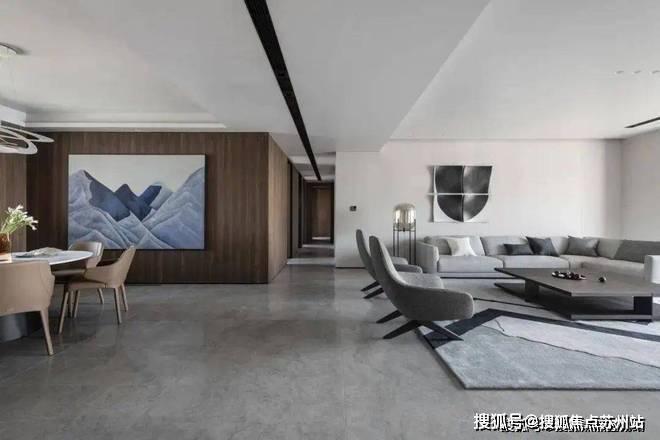 这套280㎡的大平层整体空间以灰色为主调,局部原木色相映衬加之金属质感软装进行渲染,木质的温度与质感可以更好的起到柔化空间氛围的作用,不单一、不复杂,随性又不失质感。