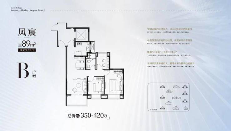 · 建面约89㎡户型则做到了3房的功能性,且三开间朝南+动静分区,设计水准颇高!
