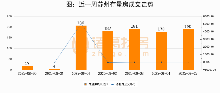 从存量房来看,2025年09月05日苏州存量房单日成交190套,比昨日增加12套,环比上涨6.7%。从近一周存量房成交来看,苏州存量房日均成交套数为138套,09月05日单日成交190套,高于近一周平均水平37.7%。