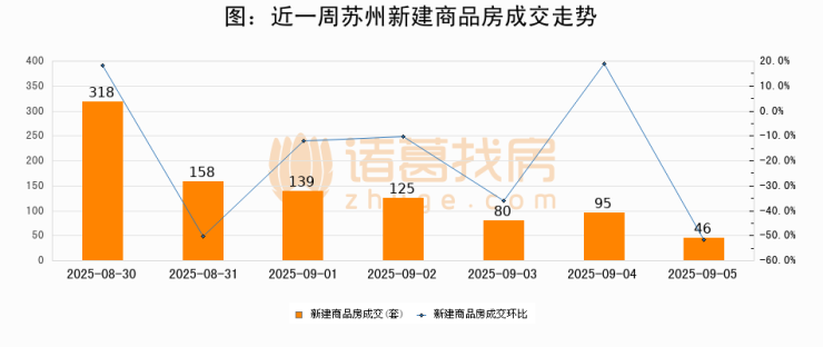 根据苏州市房地产市场和交易管理中心数据显示,2025年09月05日苏州新建商品房成交46套,较昨日减少49套,环比下降51.6%。近一周苏州新建商品房日均成交138套。09月05日单日成交46套,低于近一周平均水平66.7%。