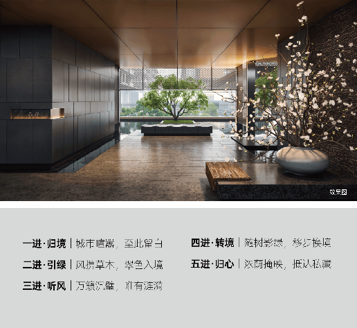 园林打造上,融合苏州园林精髓,营造"五重意境"递进式归家院落。度假式庭院、高阶会所空间、雅集架空层泛会所,让回家就像度假。