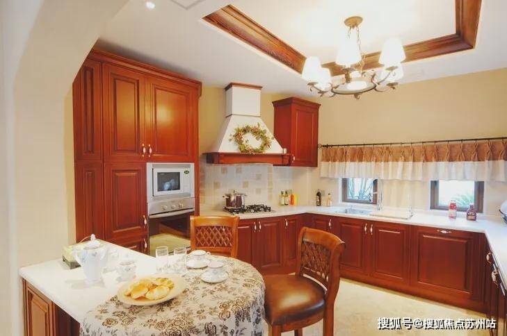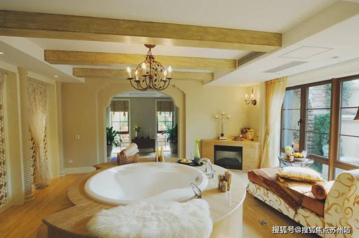 采用美国南加州的建筑风格,外立面采用淡黄色的手工Stucco抹灰外墙和红瓦屋顶,将原汁原味的南加州风格复制至此,同时融入原木、三色瓦片、红砖、铁艺、各式烟囱等元素,渗透一砖一瓦,仿佛置身异国小镇。