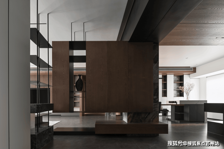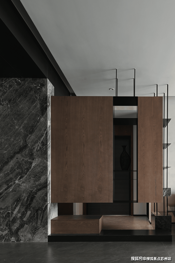 克制的材质使用和通顶的隐形门让走廊维持着外在的简约,格栅的肌理和大理石的纹路交织,悬挑和挖空带来错落的结构感,都丰富着空间的细节和层次。