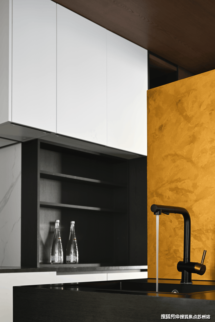 西厨是入户后看到的第一个空间,明黄色的屏风被植入这条动线,避免空间直白表达的同时,为开放的西厨保留一份隐私。