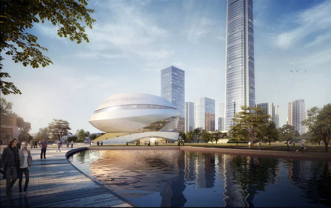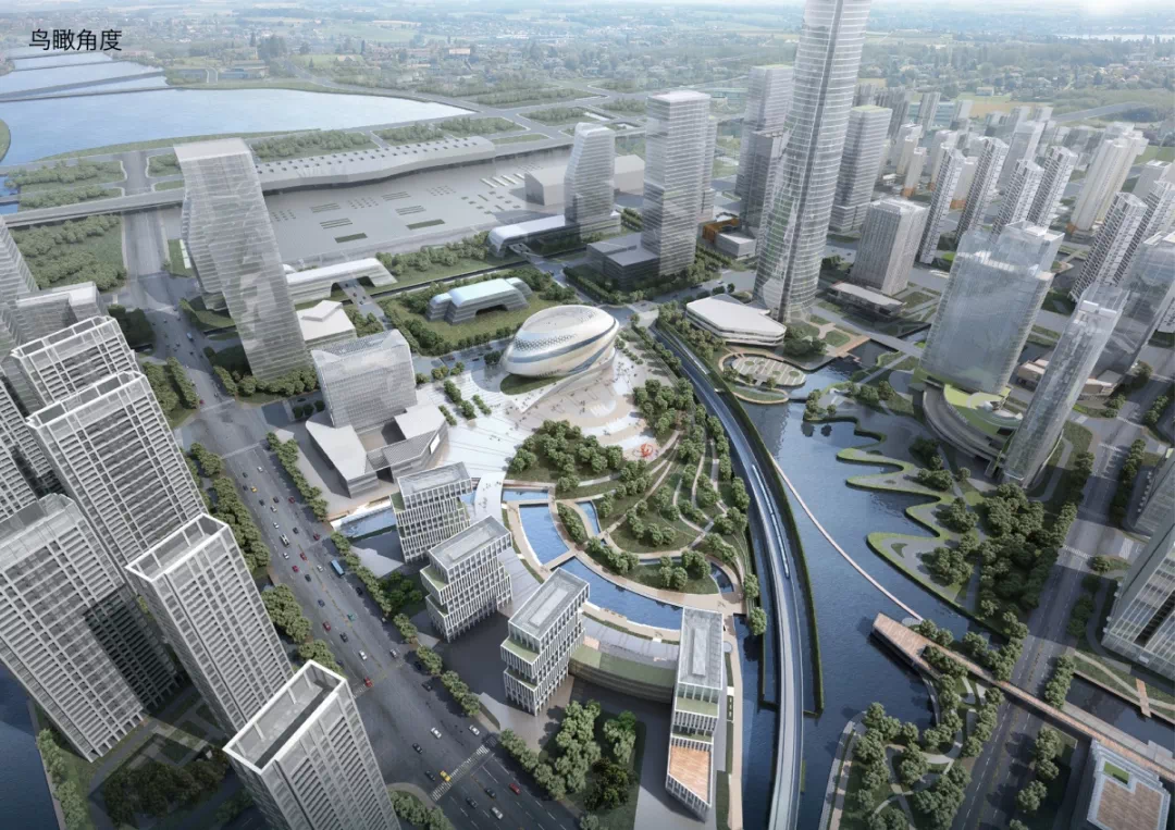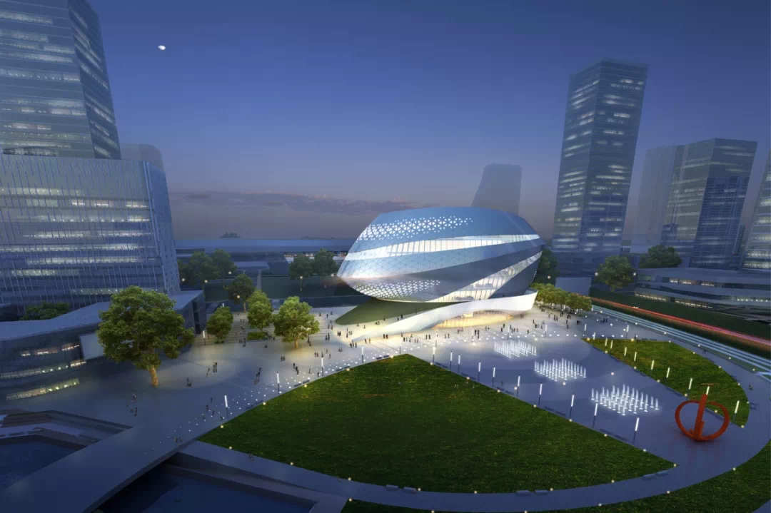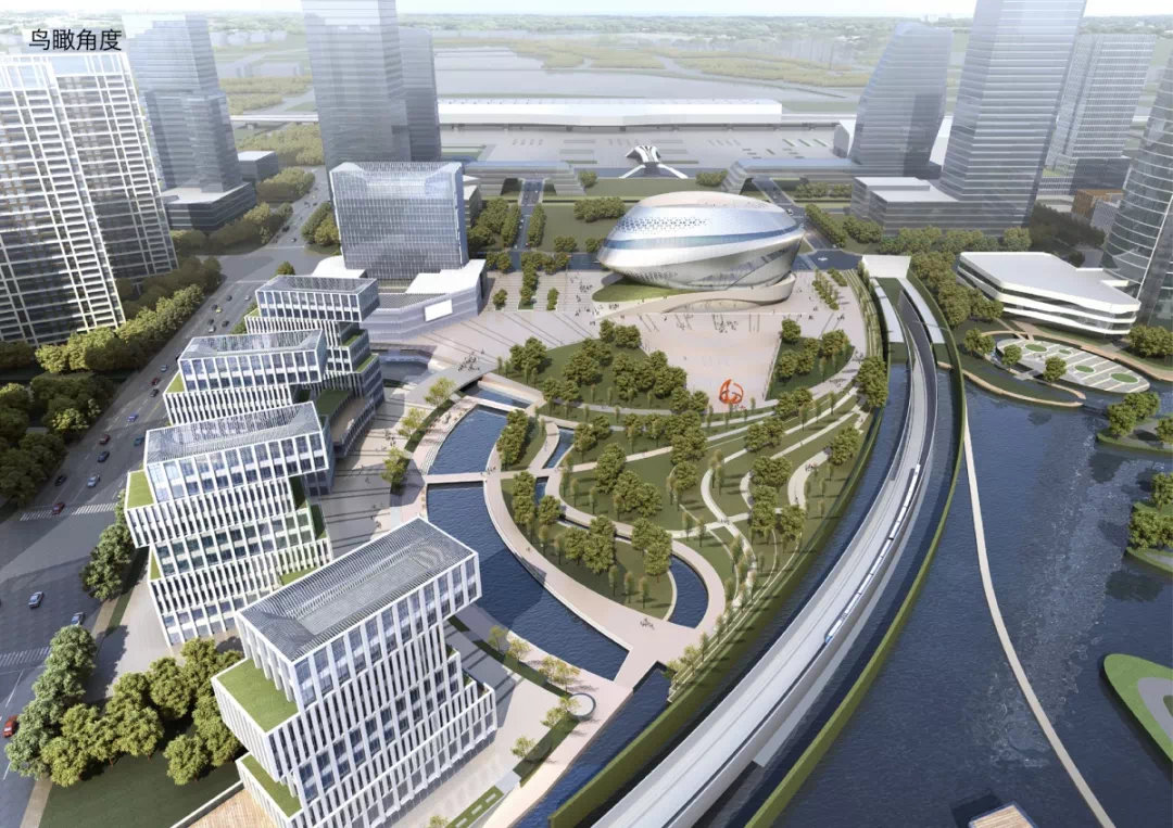 “高铁之心”以悬浮球体的科技感、旋转上升的动感、金属外墙材料的未来感,体现了与科技、速度、未来紧密联系在一起的高铁新城的城市气质。