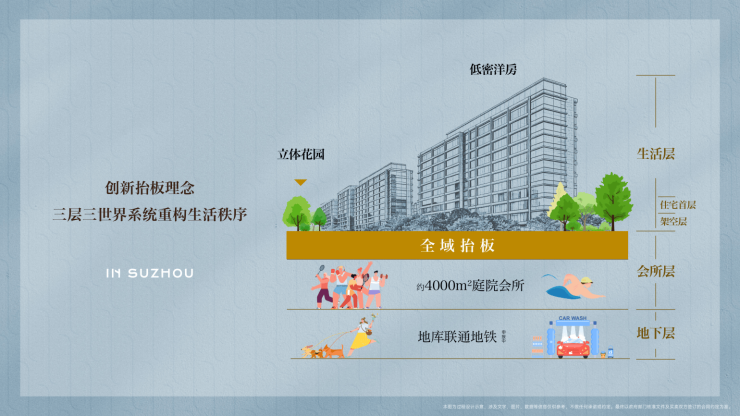 重构人与人的关系——约3米全域抬板,打造「地下通勤层-地面交互层-私域生活层」的新加坡式立体生活体系。高效又松弛,丰富且纯粹。