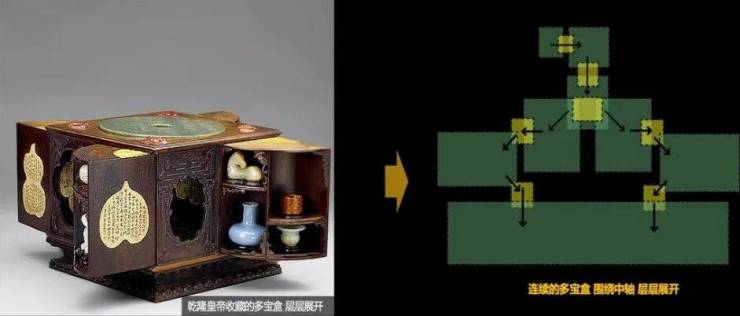空间设置正如乾隆皇帝收藏的多宝盒一般精妙,层层展开后,有无数的宝藏串联在一起,起承转折的轴线空间中,拥有着无尽的惊喜。