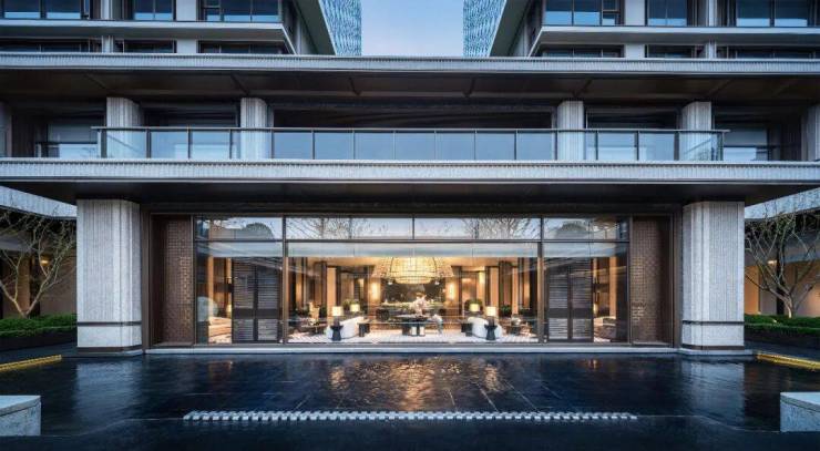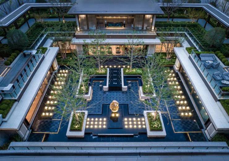 景观设计把东方园林造景的意境和意大利海派风格相互融合,采用中轴对称的方式,融入苏州传统的游廊,凭借两轴两园三进的礼序,塑造高奢酒店式的艺术生活园境,达成从热闹的城市生活到静谧的苏式园林的场景转变。
