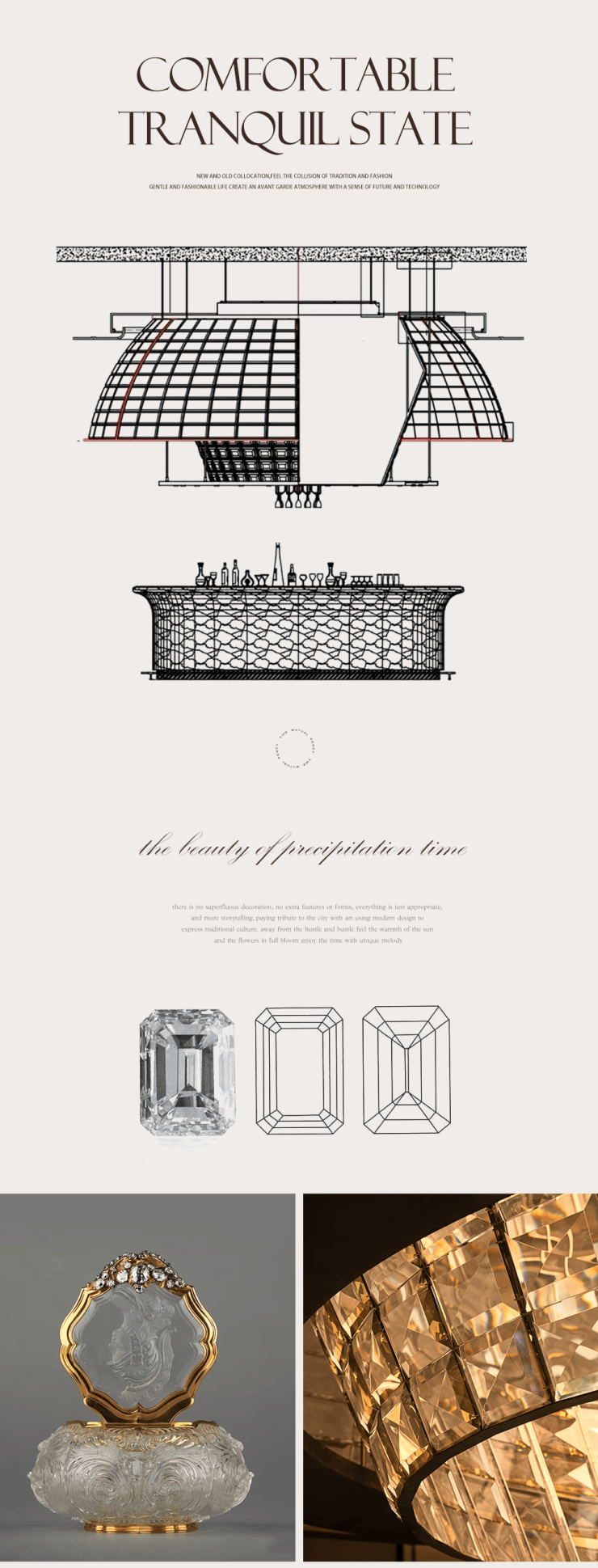 藏宝盒手工打磨璀璨水晶灯,灿烂华丽,与吧台一起,将典雅与尊贵无形之中融入空间,灵感来源是法国19世纪新艺术风格水晶技艺的经典之作,水晶古董珍宝盒华贵大气却不失庄重。