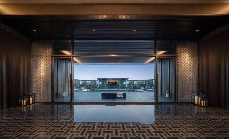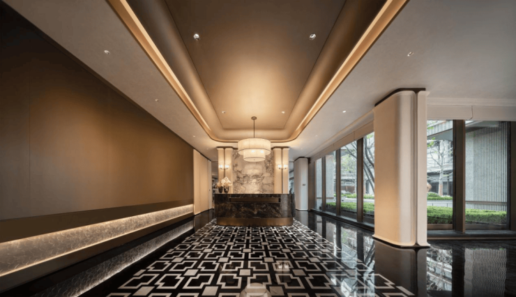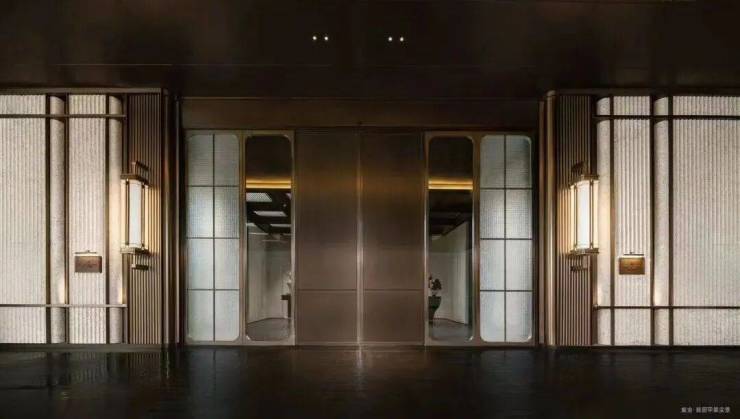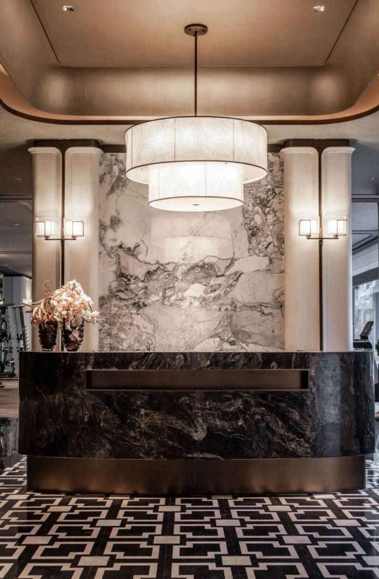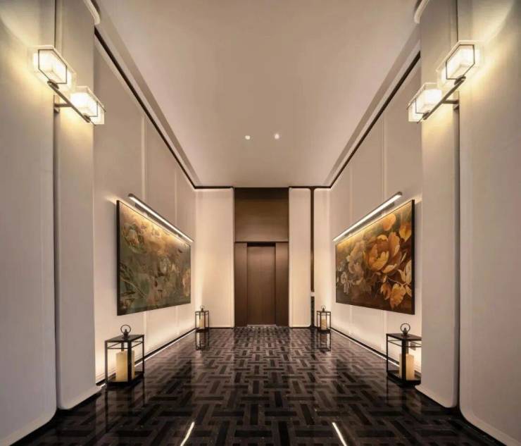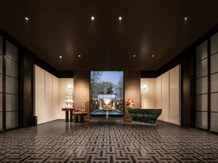 车马院以上海半岛酒店作为灵感来源,在设计方面采用了海鸥丽晶酒店同款的接待门,凸显出尊贵的大家门厅风范;营造社区归家的玄关,下挂式的星空顶、艺术雕塑、迎宾叠水以及范思哲黑背景墙相互映衬。