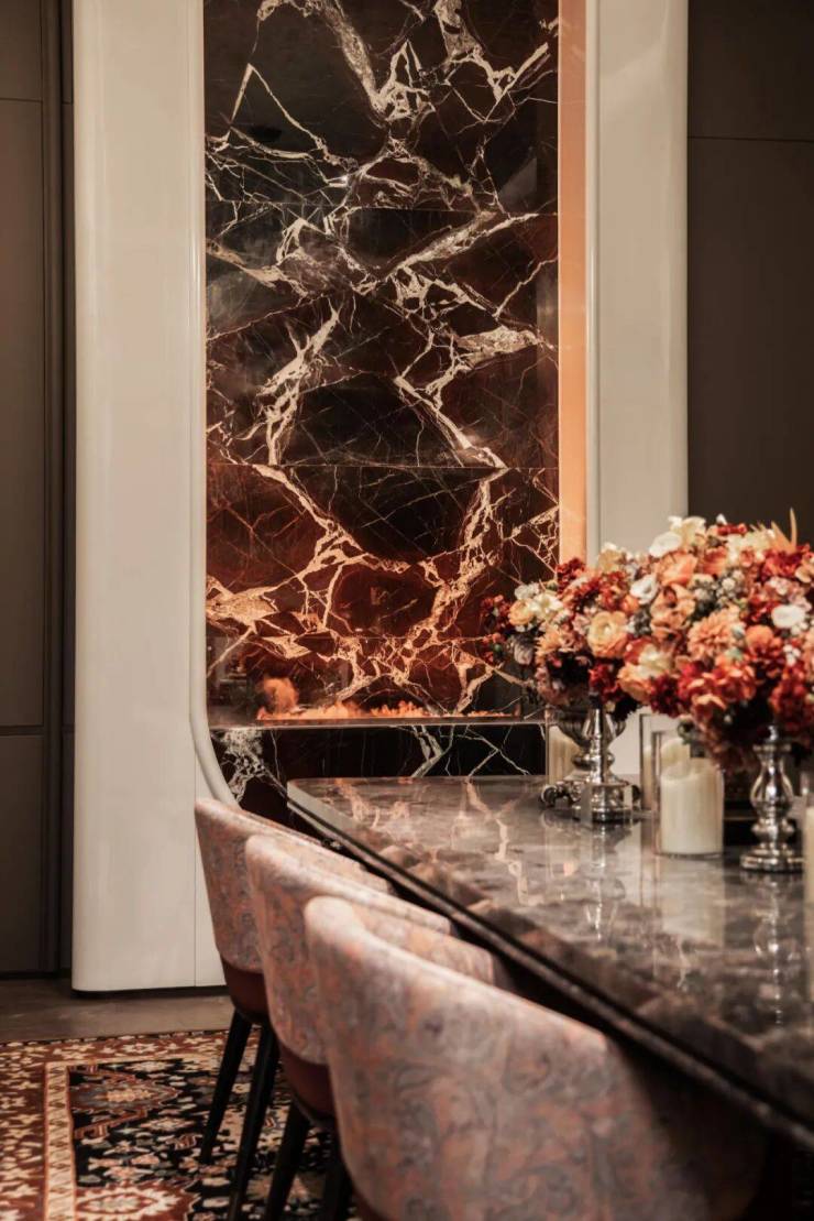 整体空间色调凝重高雅,不同的材质带动空间的丰富性与趣味性,衬托出时尚、优雅、浪漫的生活品质。不同装饰感的饰品与水晶吊灯一起,展现出一场华丽的演变。