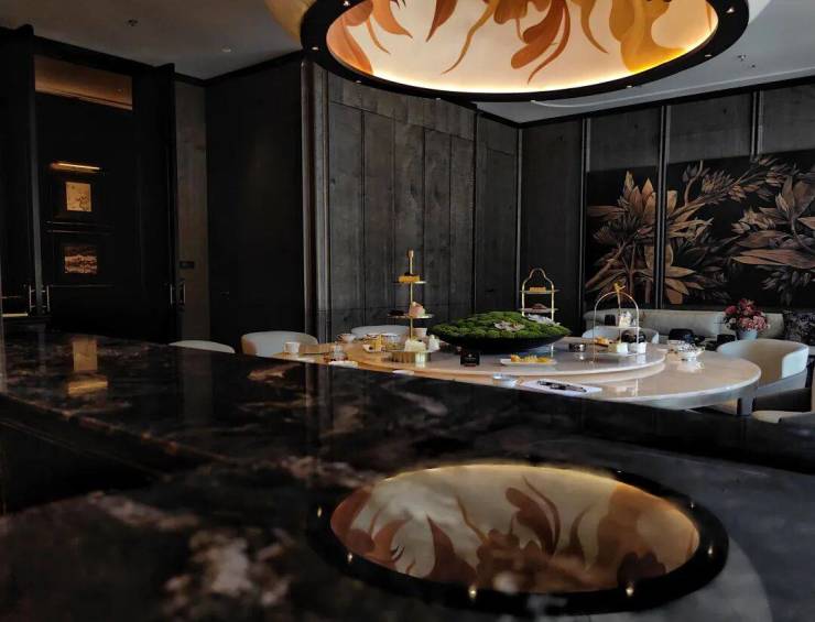 商务空间,则有铂金钻奢石打造的长桌、白宫同款的紫罗红奢石打造的背景墙。