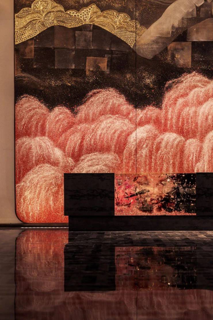 大堂地面选用天然大理石玻利维亚灰与佩纳深蓝交织。大堂两侧屏风用到了中国传统工艺金箔,在国外艺术家作品的基础上进行了二次创作,屏风以金箔为底,用描金的手法结合手绘,打造出了“夜景繁花”的感觉。