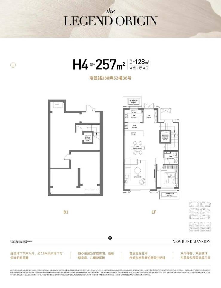 地下兴趣层: 约 5.8米 挑高 的地下 光 厅 (土建层高),可随心改造成私人艺术馆、酒廊、家庭影院,在难得一见的高度里,会晤时代大人物。合院独有的“地上+地下”双洄游归家动线,让院墅生活更具尊崇感。