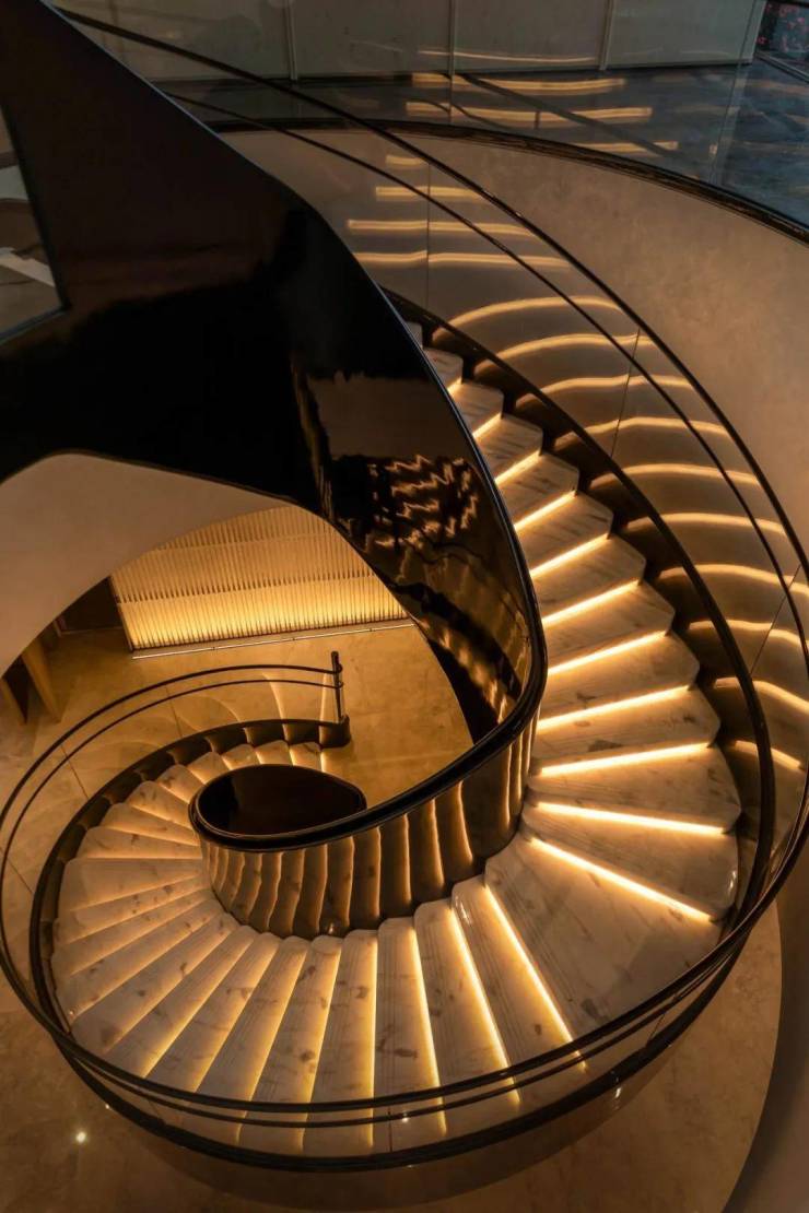 穿过瀑布,沿着螺旋艺术楼梯蜿蜒而下:约1500方下沉式会所。