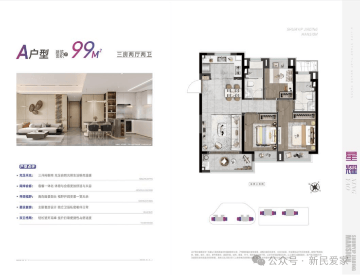 三开间朝南,采光充足;全屋飘窗配置(包含卧室、厨房及淋浴间);客餐厅采用一体化宽通厅设计,动线流畅尺度感强;主卧采用套房式设计,带独立卫浴空间,满足“私密、尊崇”的居住需求。