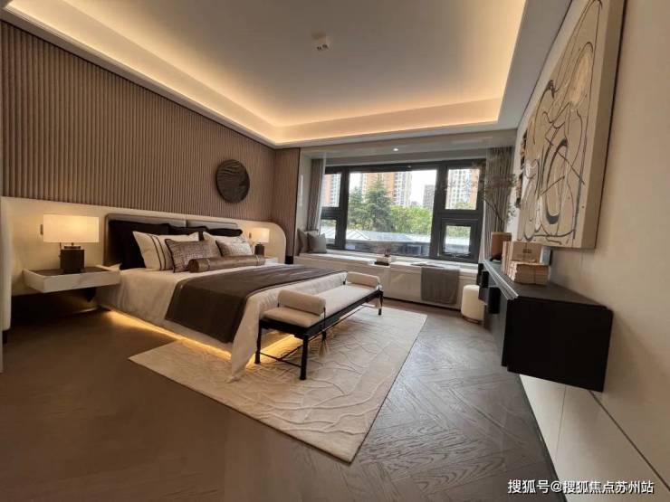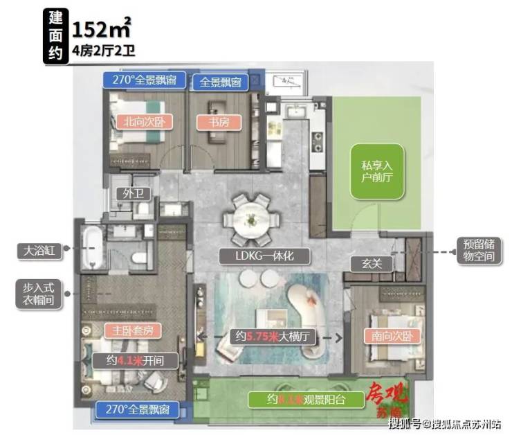 独立电梯厅入户,LDKG一体化设计;超级主卧套房开间约4.1米,媲美周边180㎡以内的主卧开间。