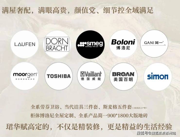 全系百年瑞士名牌 劳芬卫浴、龙头届劳斯莱斯的 当代洁具、欧洲贵族品牌 斯麦格厨电五件套(152及158户型无双开门冰箱)、 博洛尼定制全屋柜体等应有尽有。