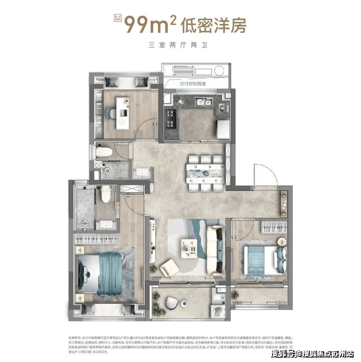 同时3房2卫的设计不仅增强了实用性,避免了早晚争用卫生间的烦恼,客卫干湿分离设计更是满满的生活幸福感!