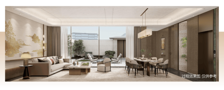 阔景庭院,围合东方逸趣。南向阳光阔院全时沐浴阳光,在有限的资源里延伸无限的诗意。生活意趣更向空中延伸,花园式露台为星空晚宴、静夜观星提供绝佳场景。