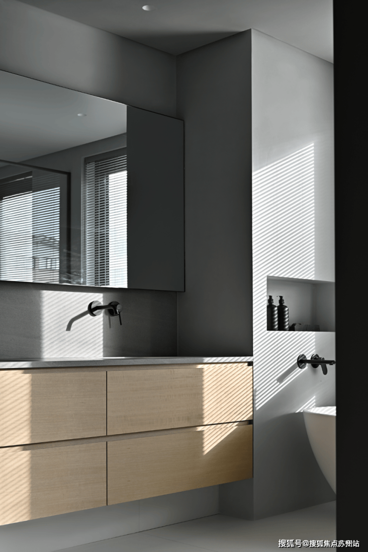 浴室贴心地做了三分离设计,完美践行了极简设计背后暗藏的功能主义.灰色与木色交融,创造出平和舒适的视觉体验.
