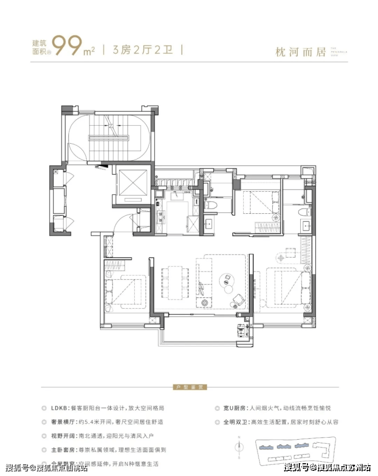 建面约99㎡滨水高层户型方正,功能性与尺度感兼得,在保证采光的同时,呈现开阔的空间场景。