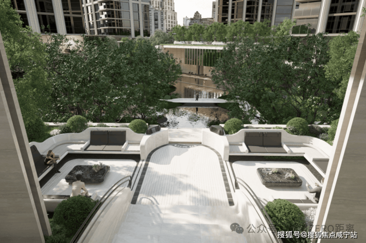 穿过园林,上海最大的约3500㎡下沉水院构成社区的核心灵魂,约13米的高差形成独特的“峡谷绿洲”,将黄浦江的水意象引入社区,中央平静水面与四周的会客舱、茶室、游泳馆形成呼应。
