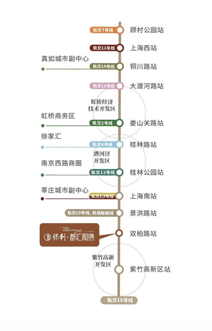 3站紫竹、4站徐汇,可换乘1号线通往徐家汇、新天地;未来19号线建成后,在景洪路站换乘可4站前滩、6站后滩,直达陆家嘴等CAZ核心。