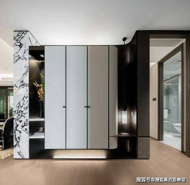 内部不仅做好了玄关柜,柜体表面还采用了豪车级皮革饰面,搭配定制金属拉手,手感和颜值很高。同时皮革材质易于清洁打理,使用耐久度也更好。