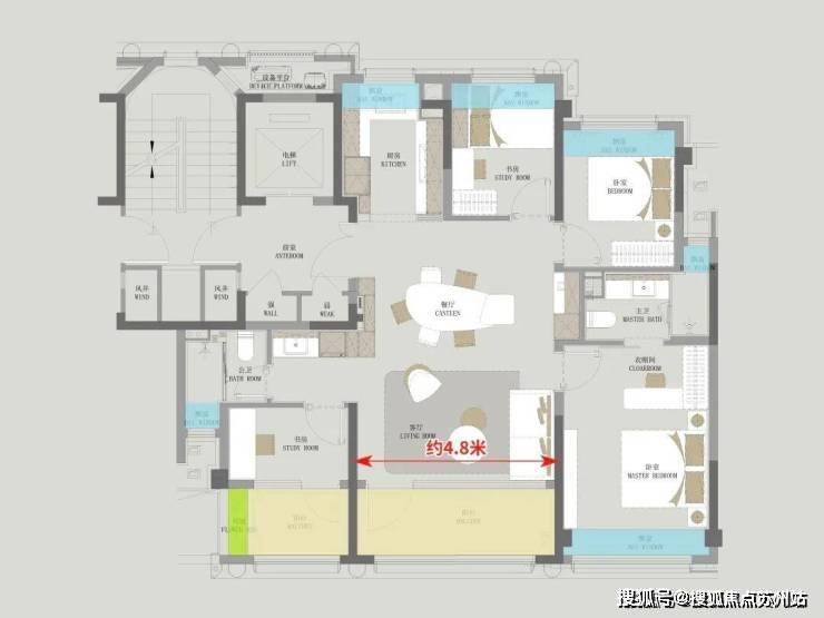 LDKB一体化,客厅面宽约4.8米,餐厅与客厅等面宽,两侧预留大面积餐边柜空间,厨房附赠飘窗;