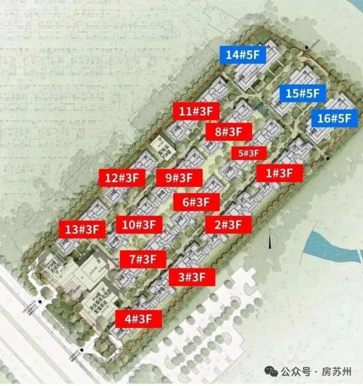 项目容积率仅1.02,规划13栋3F联排与3栋5F叠加,总户数仅约78户,面积段同步流出,联排约305-455㎡,叠加约224-412㎡;