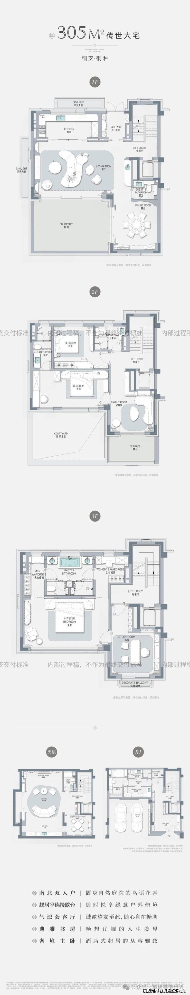 最后在附赠方面,桐安里建面约300㎡的联排别墅简直秒杀大平层,整体赠送面积比例高达约60%!具体包括地下2层空间奢阔,可以根据主人喜好,定制成如健身房、酒窖、影音室、台球房等,任凭想象。1楼庭院,绿意葱葱随心栽培。2楼观星露台,听风细雨惬意非凡。