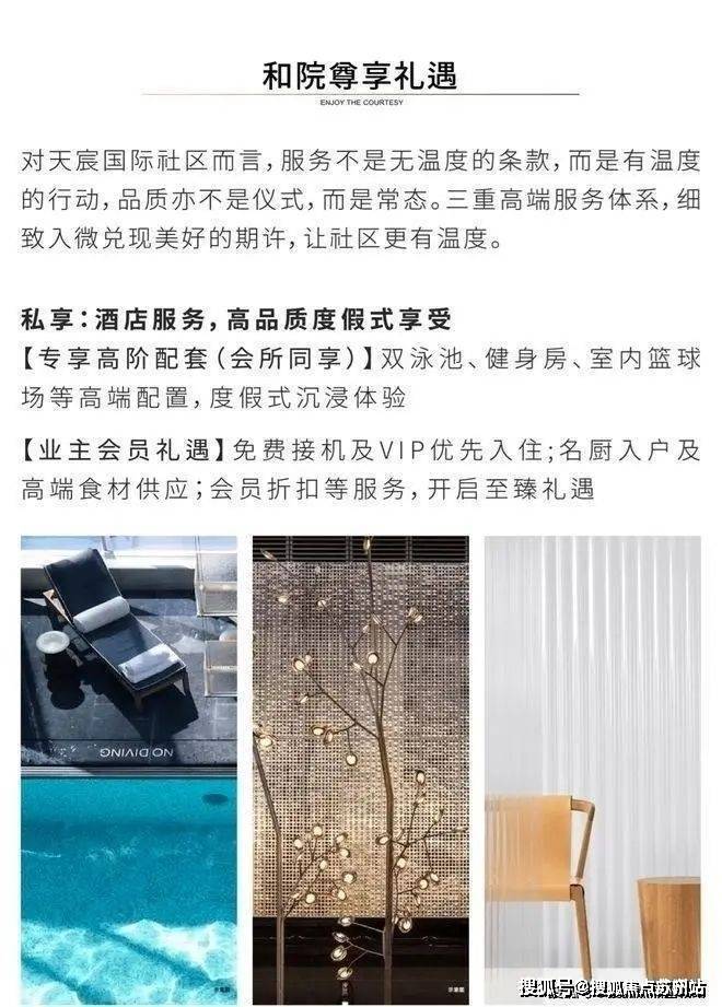 天宸国际社区售楼处电话☎:400-8123-664(预约热线)✔✔✔All courtyard rooms are delivered with fine decoration that meets the standards of five-star hotels. The main facilities and equipment are selected from international first tier brands, such as the cloakroom and wardrobe from Germany's Burley Noblia, the entrance door from Germany's Germain, the bathroom from Germany's Vibroy Boch and contemporary Dornbracht, and the kitchen hardware (stainless steel sink and faucet) from Platinum Blanco, Kitchen appliances (stoves, range hoods, dishwashers, refrigerators, steamers, ovens, washing machines, dryers, wine cabinets) are Mino MIELE or Jiagna, the whole house soft and clean water is Yikou, and the gas water heater is AO Smith, etc. (actual delivery shall prevail, and the specific brand may be adjusted to the same brand).