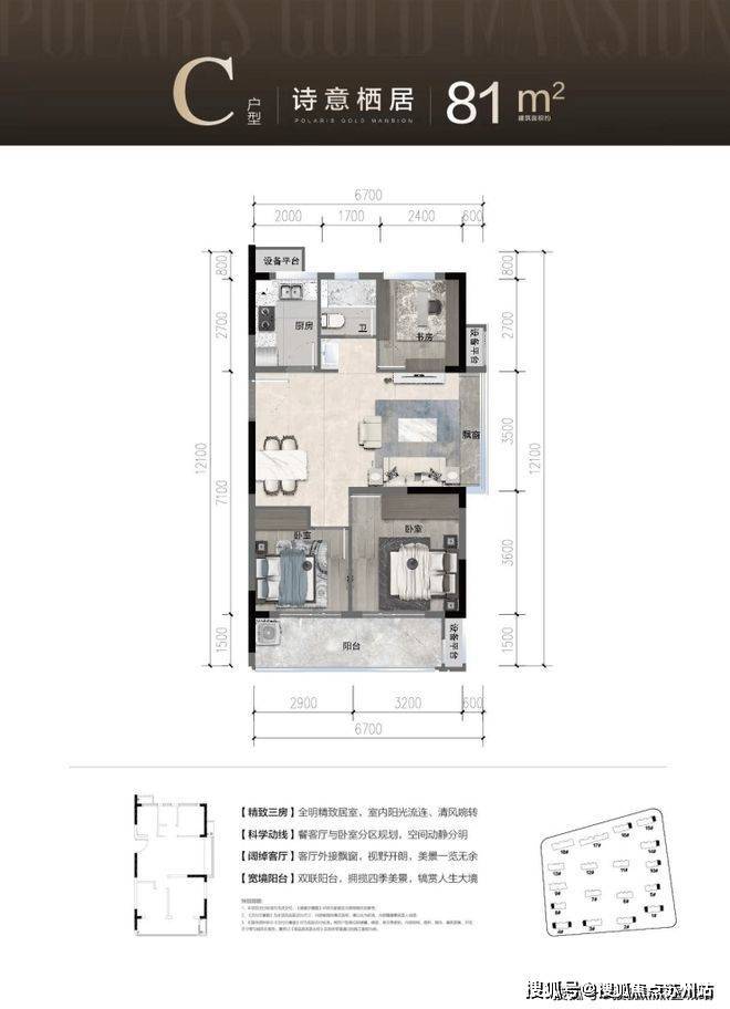 户型特色:部分户型设计有阔景横厅,采光通风良好;81-89㎡稀缺三房户型,还半赠送约 5㎡观景阳台,全赠送约 2㎡全景飘窗,得房率高达 86%。