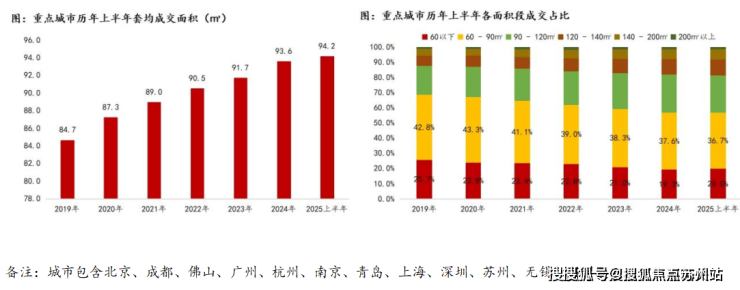 从成交套均面积来看,近年来逐步提高,小户型成交占比逐渐走低。数据显示,上半年重点城市的套均成交面积为94.2㎡,较2023年上升0.6%,较2019年上升9.5㎡。90㎡以上的成交占比占43.3%,较2019年上升11.8%。