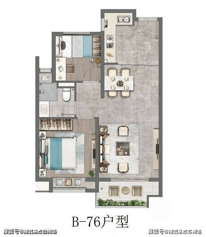 建面约76㎡的两房户型,户型相当方正,也没有多余的走廊等空间浪费;客餐厨一体化设计,让视野非常的开阔;同时,双开间朝南的设计,保证了室内采光、通风的优秀。